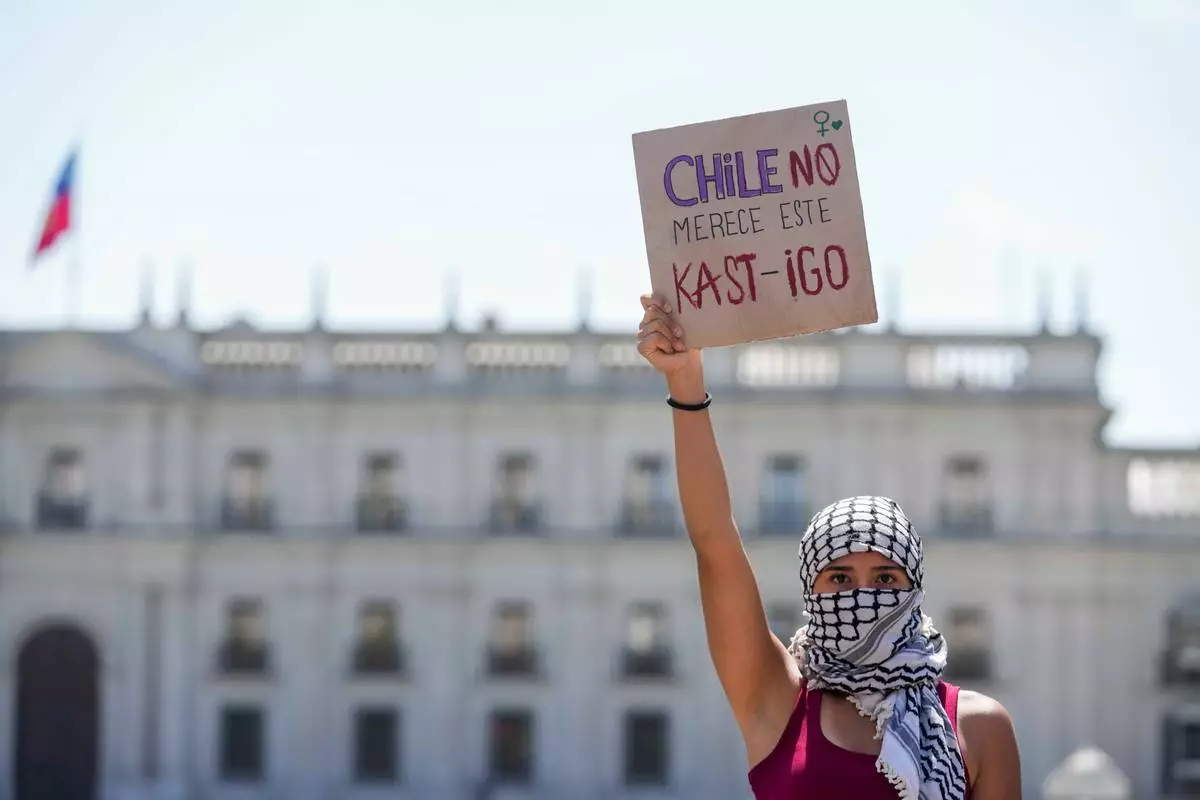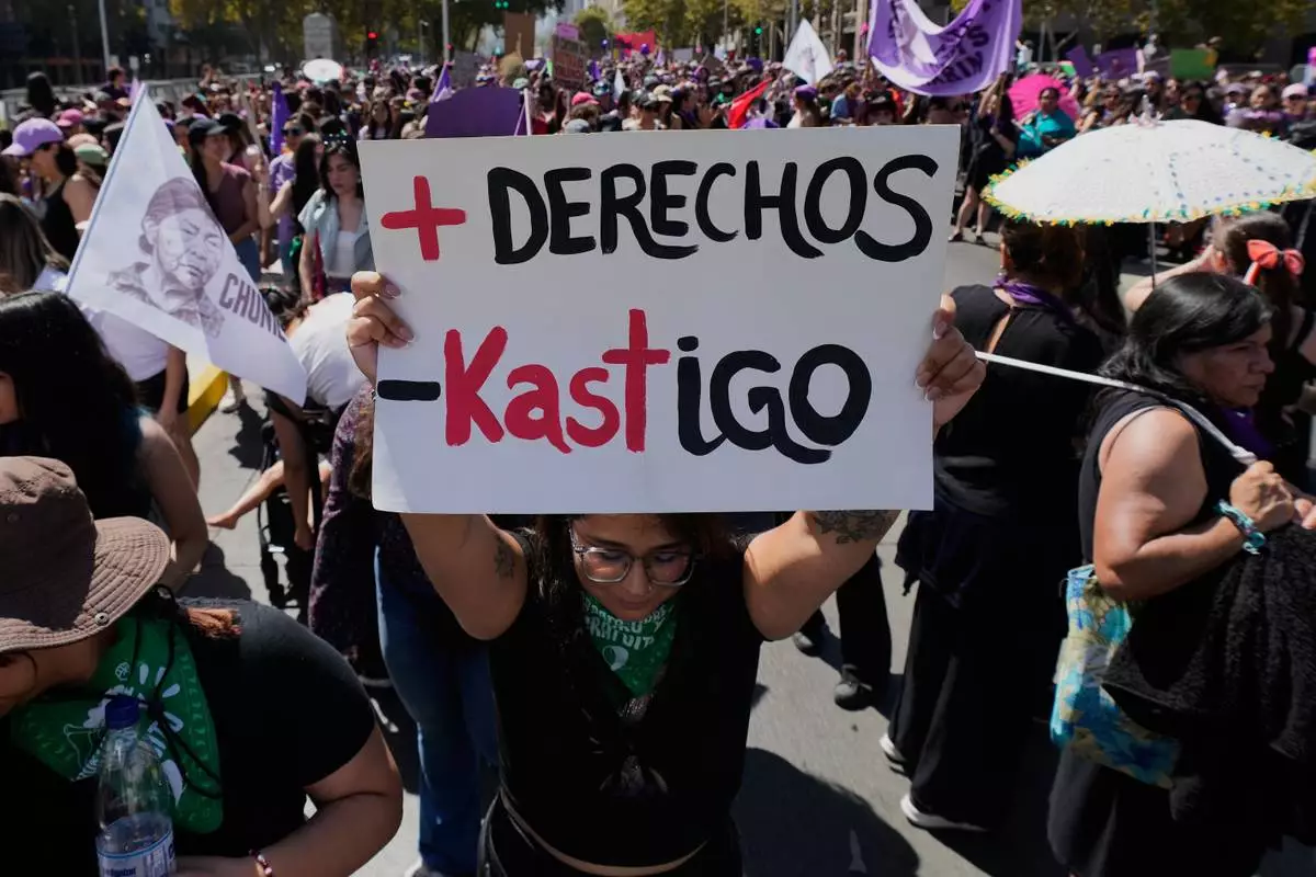 A woman holds a banner that reads in Spanish, "Chile does not deserve this punishment," a pun in reference to Chile's President-elect Jose Antonio Kast, during an International Women's Day protest in Santiago, Chile, Sunday, March 8, 2026. (AP Photo/Esteban Felix)
