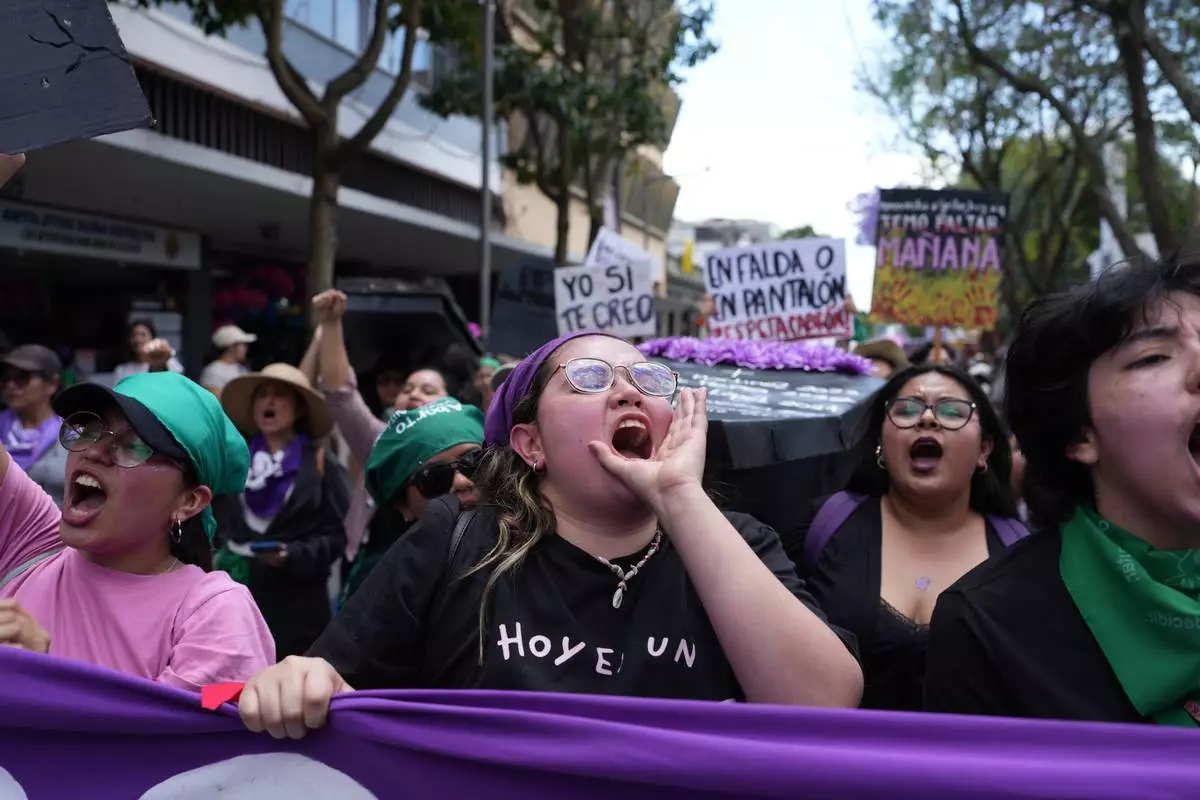 Protesters take part in a rally marking International Women's Day, at the Zocalo in Mexico City, Sunday, March 8, 2026. (AP Photo/Ginnette Riquelme)