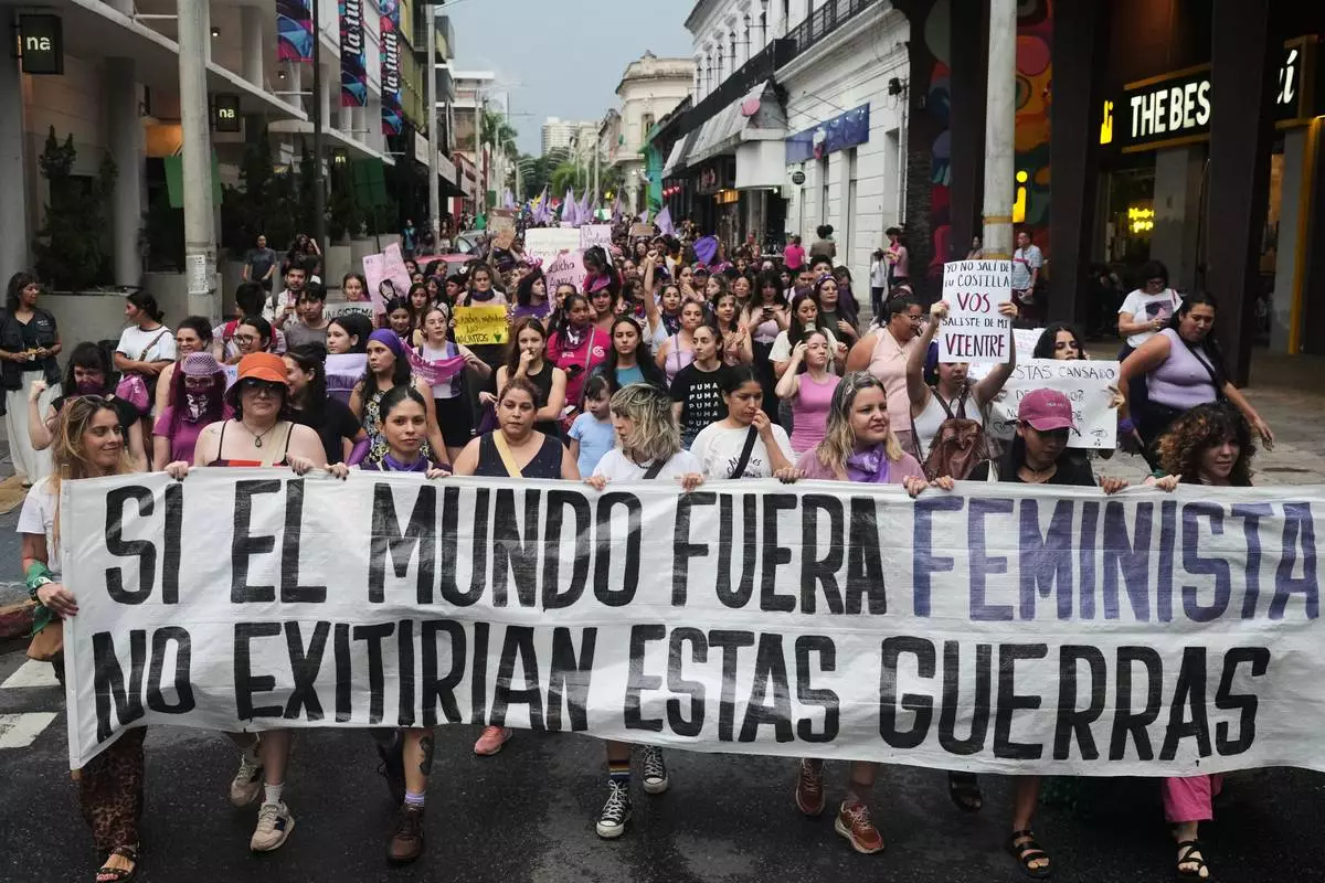 People hold a banner that reads in Spanish, "If the world were feminist, these wars would not exist" during a march marking International Women's Day in Asuncion, Paraguay, Sunday, March 8, 2026. (AP Photo/Jorge Saenz)