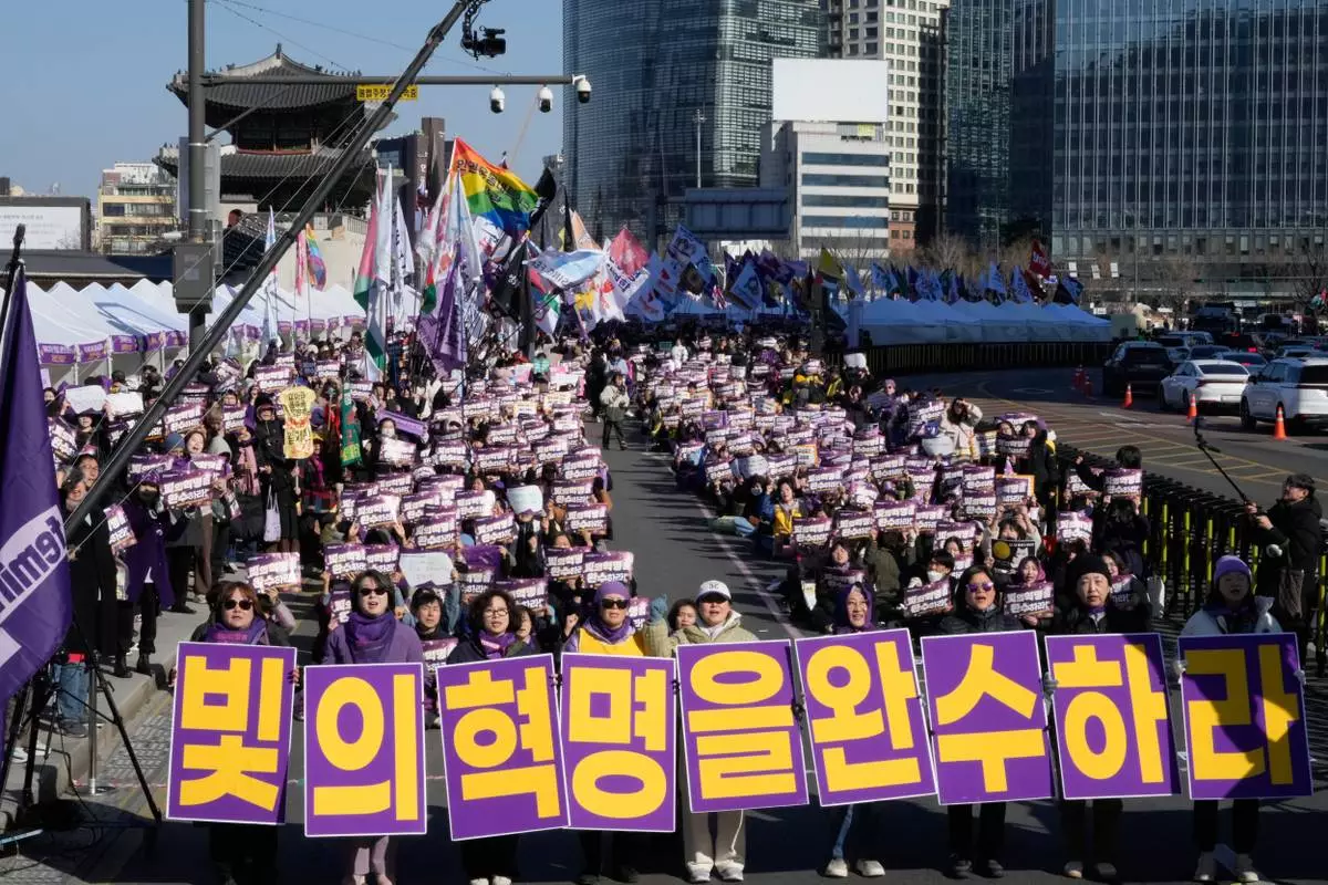 South Korean activists gather a day ahead of International Women's Day in Seoul, South Korea, Saturday, March 7, 2026. The banners read "Complete the revolution of light." (AP Photo/Ahn Young-joon)