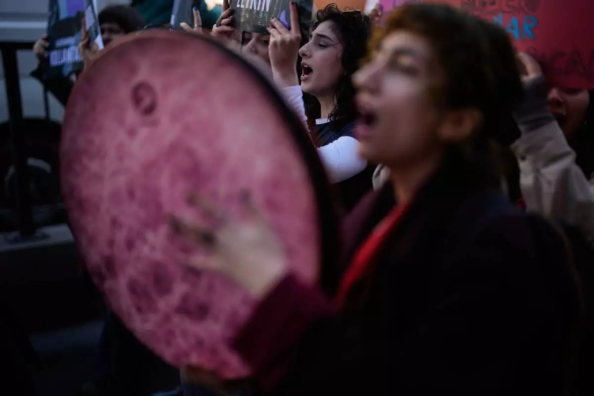 Women shout slogans as they march during a protest marking the International Women's Day, in Istanbul, Turkey, Sunday, March 8, 2026. (AP Photo/Khalil Hamra)
