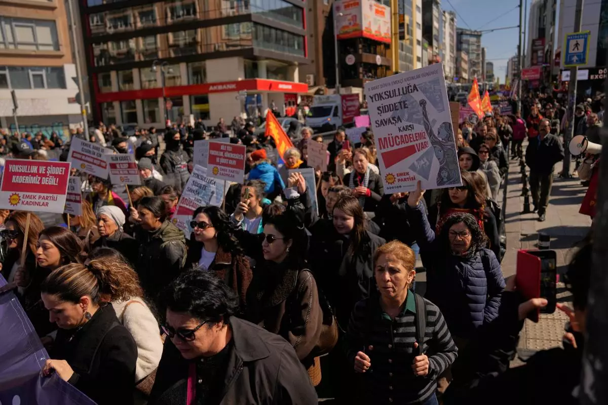 Women march during a protest marking the International Women's Day, in Istanbul, Turkey, Sunday, March 8, 2026. Placard reads in Turkish: "We fight against poverty, violence, and war!". (AP Photo/Khalil Hamra)