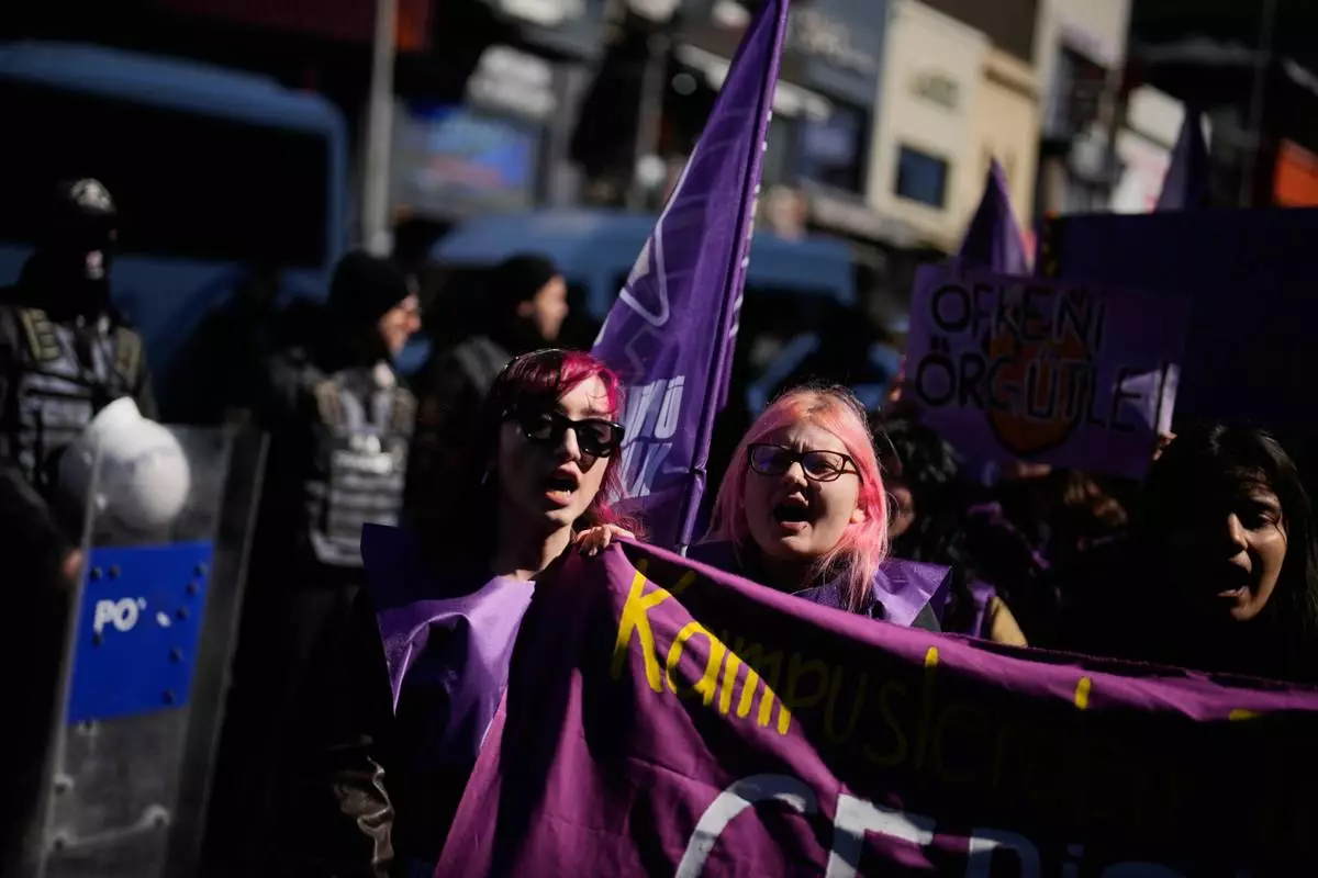 Women shout slogans as they march during a protest marking the International Women's Day, in Istanbul, Turkey, Sunday, March 8, 2026. (AP Photo/Khalil Hamra)