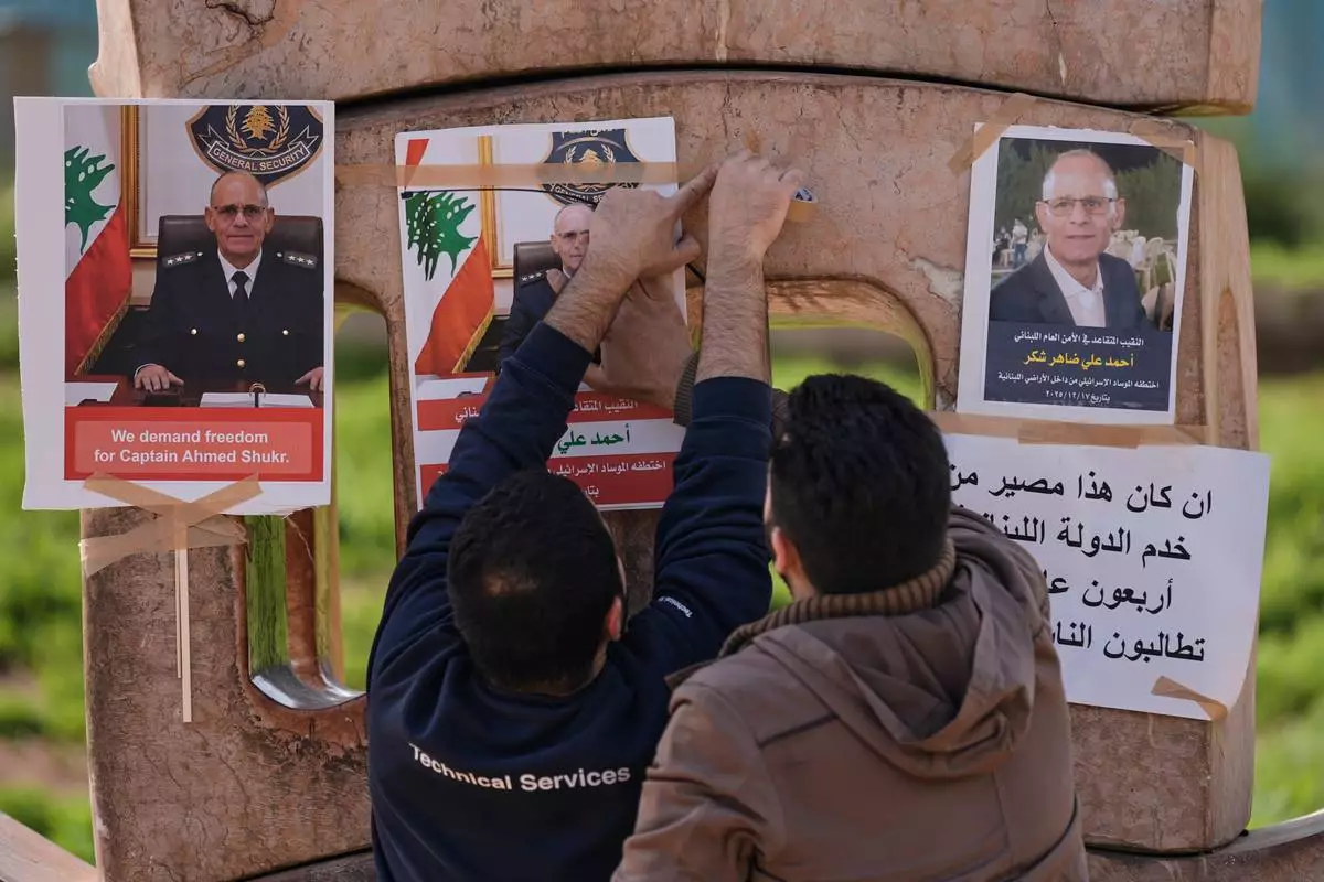 Family members of retired Lebanese officer Ahmed Shukr, hang posters of him during a gathering outside the headquarters of the U.N. Economic and Social Commission for Western Asia, ESCWA, in Beirut, Lebanon, Friday, Feb. 13, 2026. (AP Photo/Bilal Hussein)
