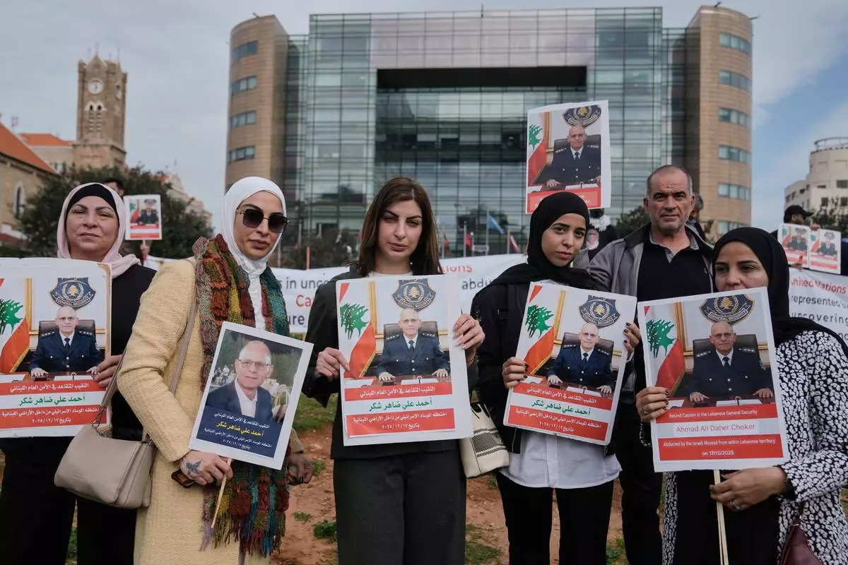 Relatives and friends of retired Lebanese officer Ahmed Shukr, hold posters of him during a gathering outside the headquarters of the U.N. Economic and Social Commission for Western Asia, ESCWA, in Beirut, Lebanon, Friday, Feb. 13, 2026. (AP Photo/Bilal Hussein)
