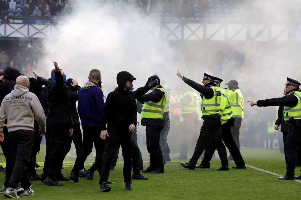 Supporters from both teams ran down from the stands at Ibrox with flares thrown and several altercations before the situation was brought under control.