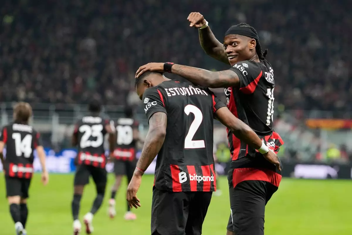 AC Milan's Pervis Estupinan, centre, celebrates with Rafael Leao after scoring the opening goal during the Serie A soccer match between AC Milan and Inter Milan, in Milan, Italy, Sunday, March 8, 2026. (AP Photo/Luca Bruno)