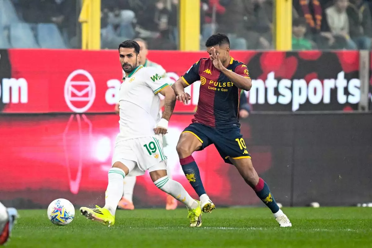 Genoa's Junior Messias, right, fights for the ball with Roma's Zeki Celik during the Italian Serie A soccer match between Genoa and Roma in Genoa, Italy, Sunday, March 8, 2026. (Tano Pecoraro/LaPresse via AP)