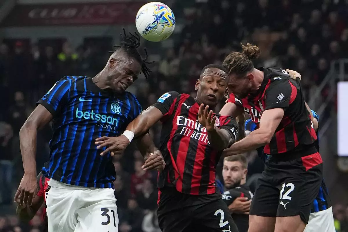 Inter Milan's Yann Bisseck, left, AC Milan's Pervis Estupinan, center, and Adrien Rabiot jump for the ball during the Serie A soccer match between AC Milan and Inter Milan, in Milan, Italy, Sunday, March 8, 2026. (AP Photo/Antonio Calanni)