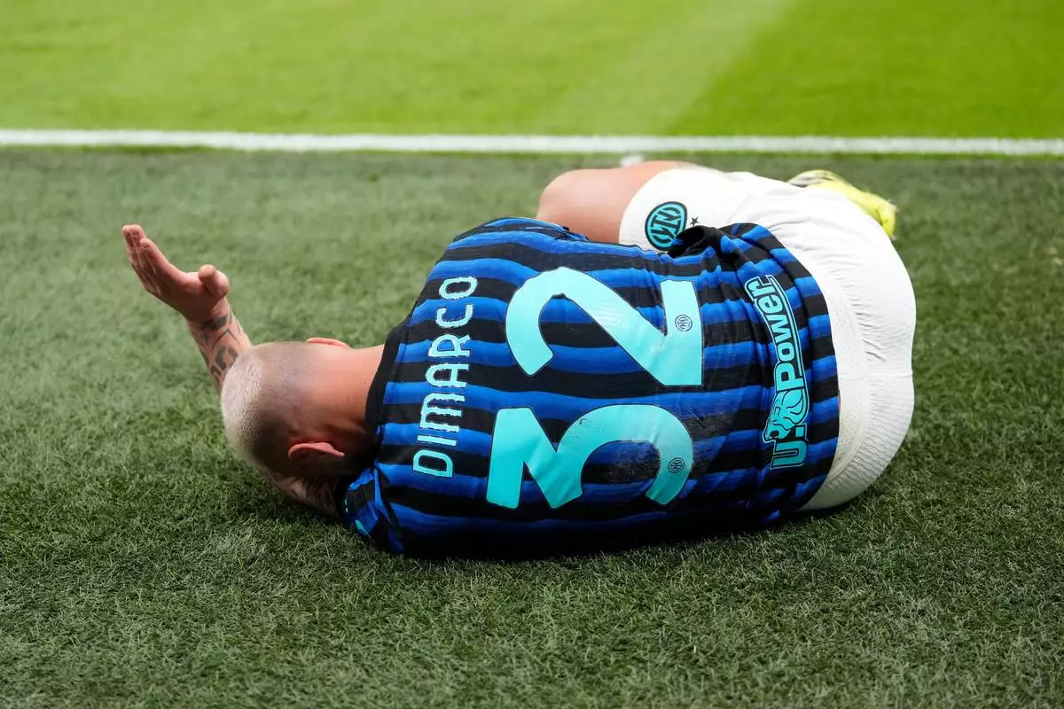 Inter Milan's Federico Dimarco lies on the pitch in pain during the Serie A soccer match between AC Milan and Inter Milan, in Milan, Italy, Sunday, March 8, 2026. (AP Photo/Luca Bruno)