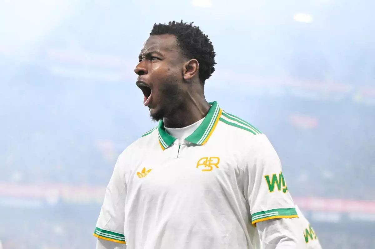 Roma's Evan Ndicka celebrates after scoring during the Italian Serie A soccer match between Genoa and Roma in Genoa, Italy, Sunday, March 8, 2026. (Tano Pecoraro/LaPresse via AP)