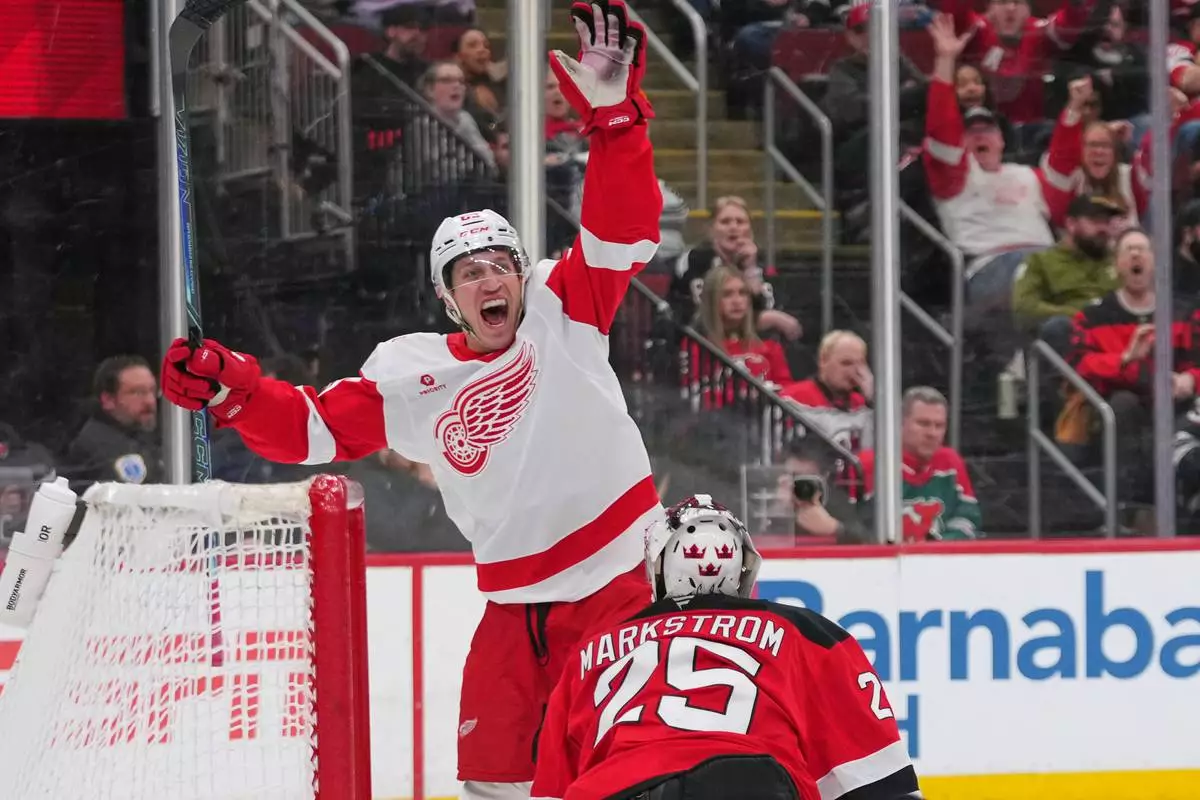 Detroit Red Wings' Dominik Shine (65) celebrates after shooting the puck past New Jersey Devils goaltender Jacob Markstrom (25) for a goal during the third period of an NHL hockey game Sunday, March 8, 2026, in Newark, N.J. (AP Photo/Frank Franklin II)