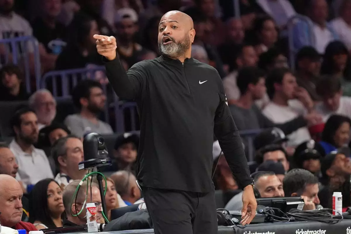 Detroit Pistons head coach J.B. Bickerstaff gestures during the first half of an NBA basketball game against the Miami Heat Sunday, March 8, 2026, in Miami. (AP Photo/Marta Lavandier)