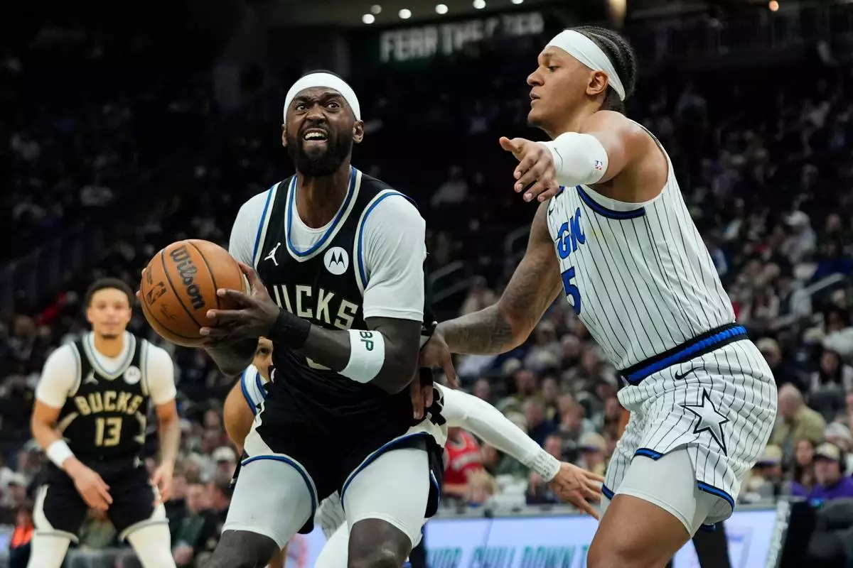 Milwaukee Bucks' Bobby Portis, left, looks to shoot against Orlando Magic's Paolo Banchero during the first half of an NBA basketball game, Sunday, March 8, 2026, in Milwaukee. (AP Photo/Aaron Gash)