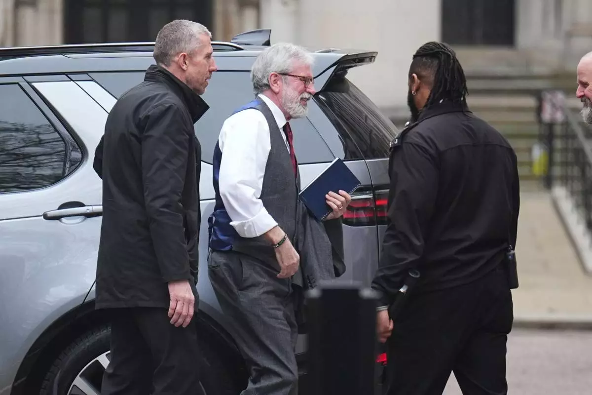 Former Sinn Fein president Gerry Adams, center, arrives at the Royal Courts of Justice, where a civil claim is being brought against him, in London, Monday March 9, 2026. ( James Manning/PA via AP)