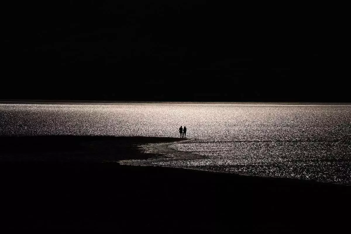 People stand along Lake Manly, an ephemeral lake at Badwater Basin, Saturday, March 7, 2026, in Death Valley National Park, Calif. (AP Photo/John Locher)