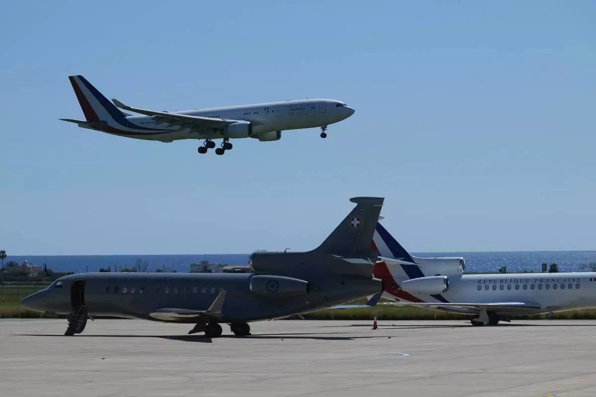 The aircraft transporting French President Emmanuel Macron lands ahead of his meeting with Greece's Prime Minister Kyriakos Mitsotakis and Cyprus President Nikos Christodoulides at Andreas Papandreou Air Base in Paphos, Cyprus, on Monday, March 9, 2026. (AP Photo/Petros Karadjias)