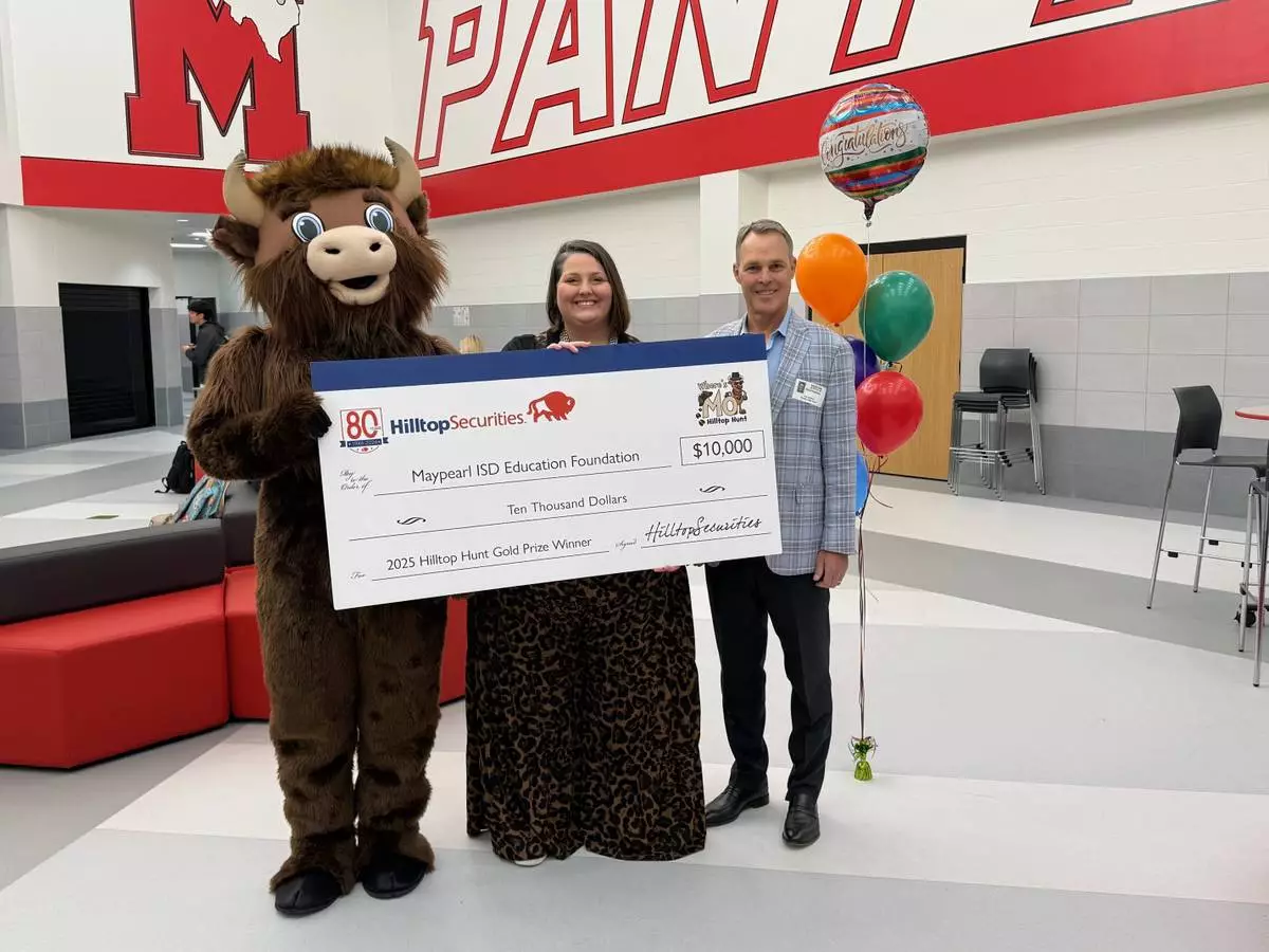 HilltopSecurities Chief Operating Officer David Holleran and mascot Mo the Buffalo visited Kayle Davis to present her with a $10,000 check for the Maypearl Education Foundation. Davis is a teacher at Maypearl High School in Maypearl, Texas.