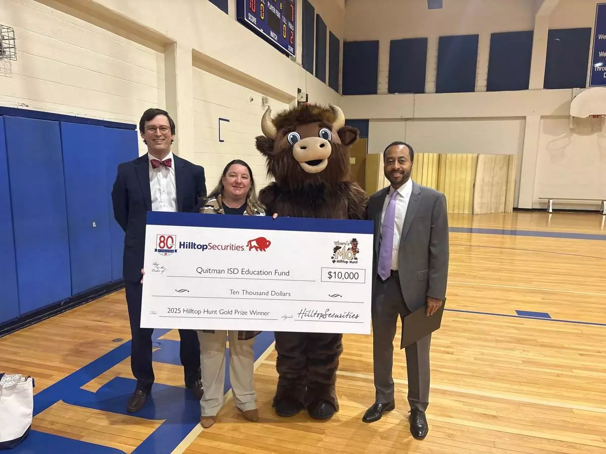 Mo the Buffalo and HilltopSecurities Head of New Business Development Clayton Sheppard visited Connie Simon to present her with a $10,000 check for the Quitman Lake Country Charitable Foundation in support of the Quitman ISD Education Fund. Simon is a special education teacher at Quitman Junior High in Quitman, Texas.