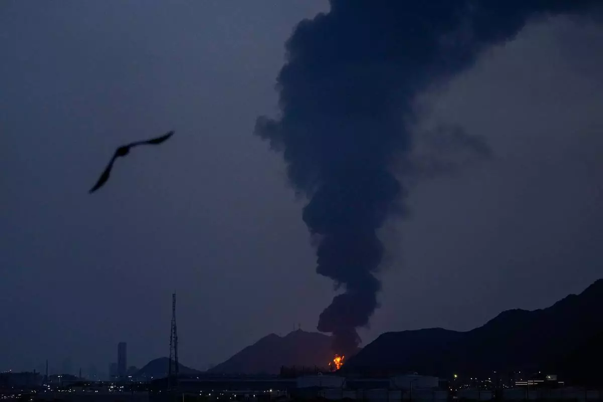 Large fire and plume of smoke is visible after, according to the authorities, debris of an Iranian intercepted drone hit the Fujairah oil facility, in Fujairah, United Arab Emirates, Tuesday, March 3, 2026. (AP Photo/Altaf Qadri)