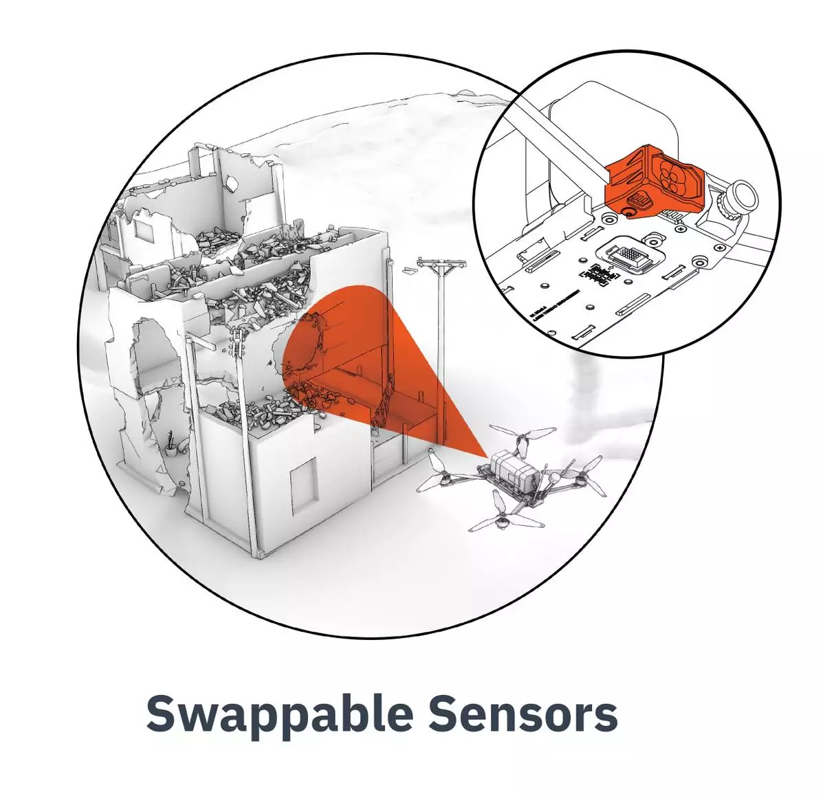 Interchangeable multi-sensor payload suite, including electro-optical (EO) camer, downward-facing camera, EO illuminator, infrared (IR) illuminator and thermal camera.