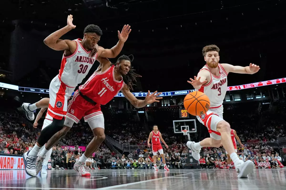 Houston's Joseph Tugler (11) chases a loose ball between Arizona's Tobe Awaka (30) and Anthony Dell'Orso (3) during the first half of an NCAA college basketball game in the championship of the Big 12 Conference tournament Saturday, March 14, 2026, in Kansas City, Mo. (AP Photo/Charlie Riedel)