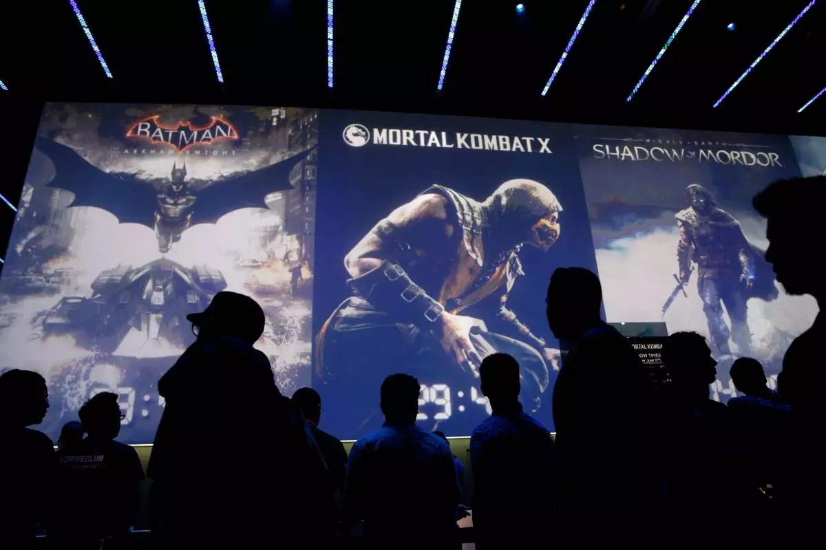 FILE - People wait in line for theater presentations for video games including Batman, Mortal Kombat X and Shadow of Mordor at the WB Games booth at the Electronic Entertainment Expo, Wednesday, June 11, 2014, in Los Angeles. (AP Photo/Jae C. Hong, File)
