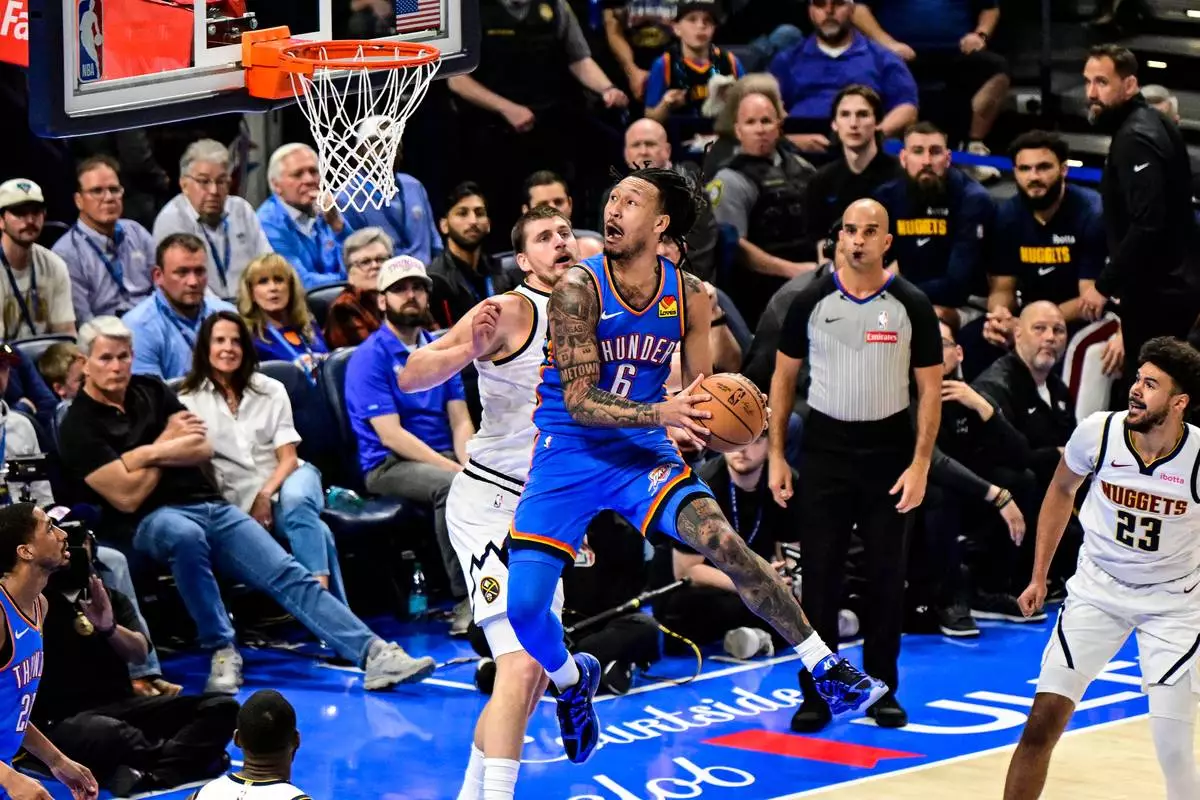 With Oklahoma City leading 126-122, Denver's Nikola Jokic hit a 3-pointer and Oklahoma City's Jaylin Williams was called for an off-ball foul fighting through a screen. Jamal Murray made the free throw with 8.5 seconds remaining to tie the game.