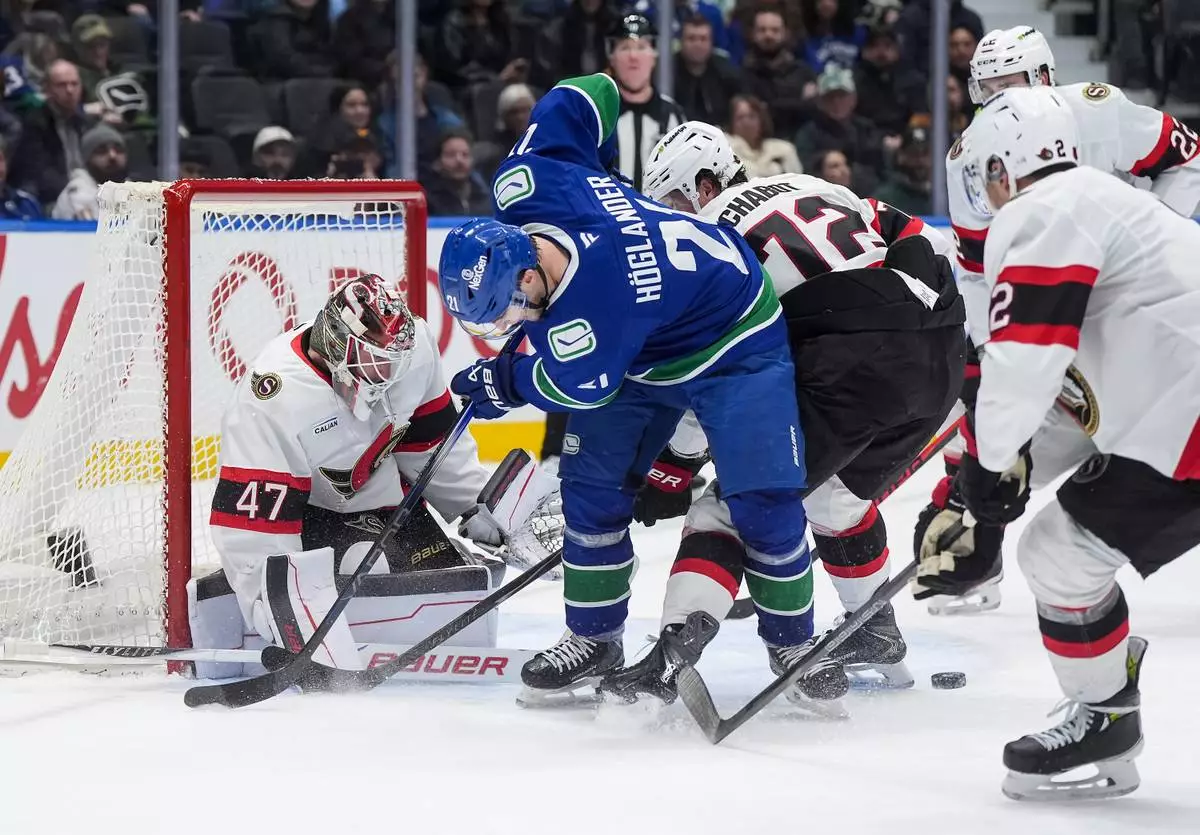 Vancouver Canucks' Nils Hoglander (21) looks for the puck after being stopped by Ottawa Senators goalie James Reimer (47) as Thomas Chabot (72) defends during the third period of an NHL hockey game, in Vancouver, on Monday, March 9, 2026. (Darryl Dyck/The Canadian Press via AP)