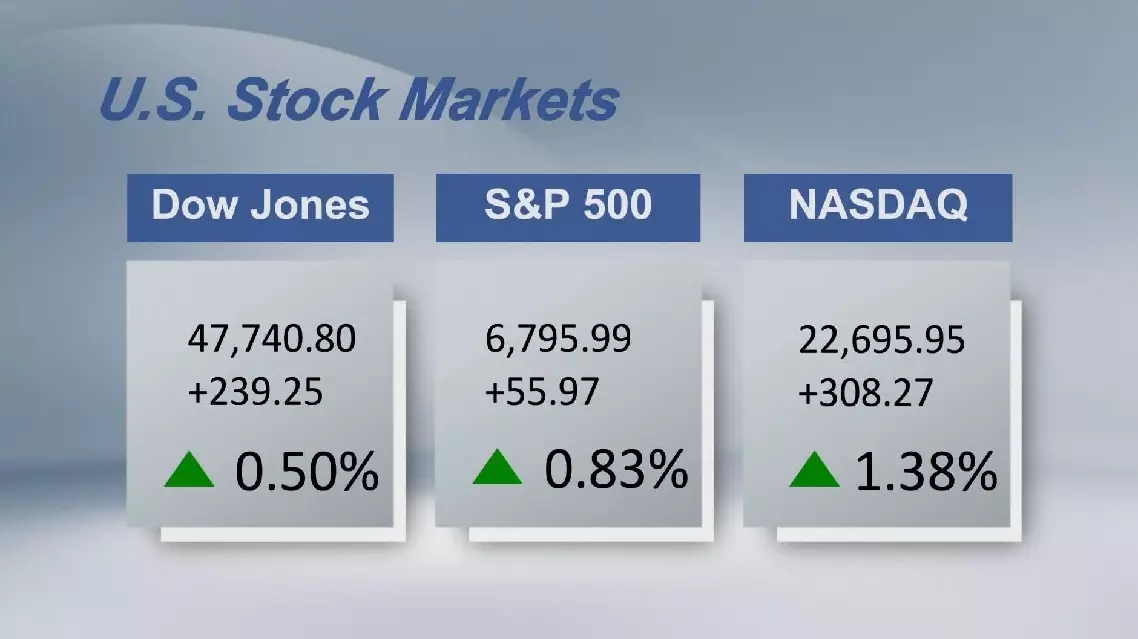 The Dow Jones Industrial Average rose 239.25 points or 0.5 percent, to 47,740.8. The S and P 500 added 55.97 points or 0.83 percent to 6,795.99. The Nasdaq Composite Index increased by 308.27 points or 1.38 percent, to 22,695.95.