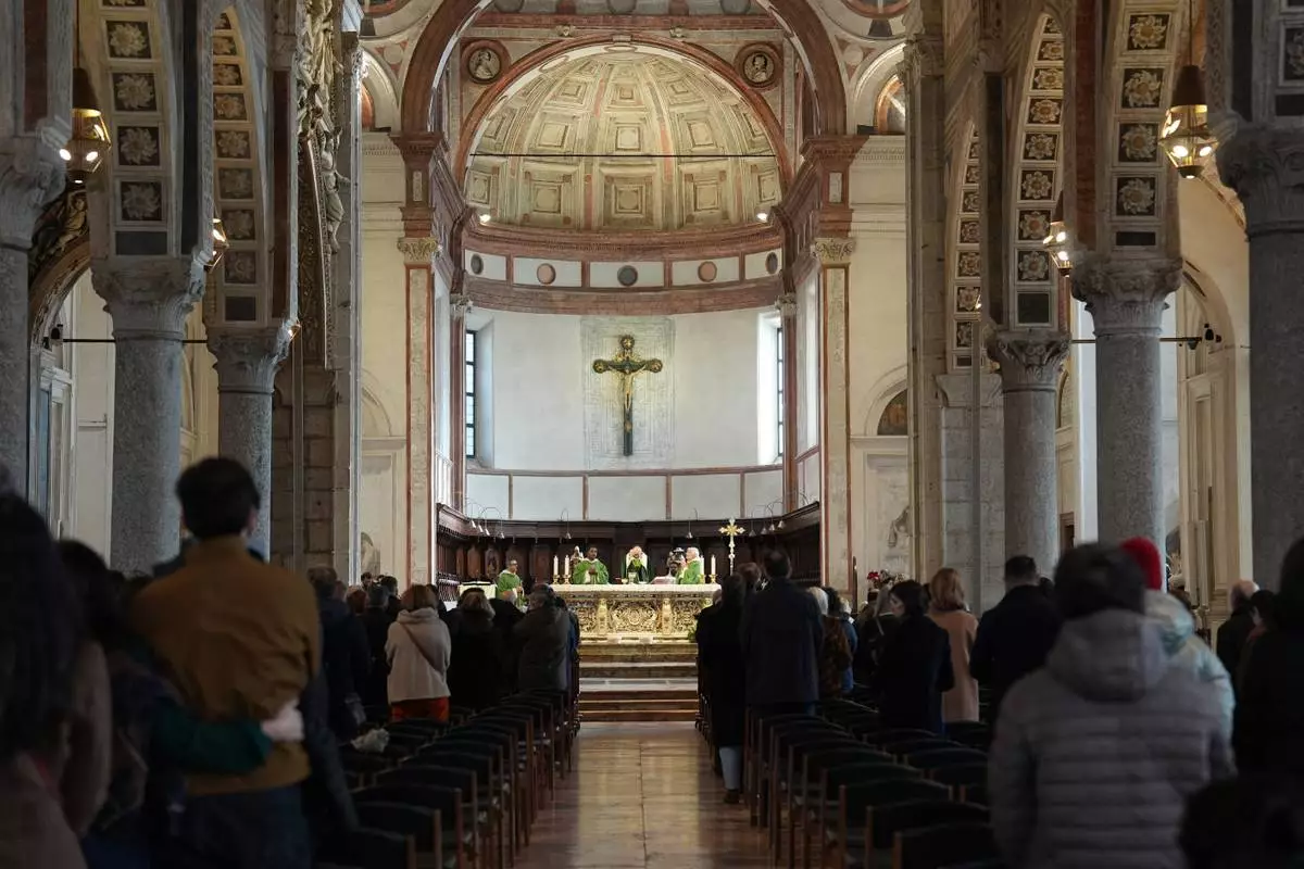Worshippers attend Mass at the Basilica of Santa Maria delle Grazie, best known as the home of Leonardo da Vinci's "The Last Supper," in Milan, Italy, Sunday, Feb. 15, 2026. (AP Photo/María Teresa Hernández)