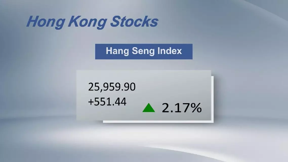 Hong Kong's stock market ended higher on Tuesday with the benchmark Hang Seng Index up 2.17 percent to close at 25,959.90 points.