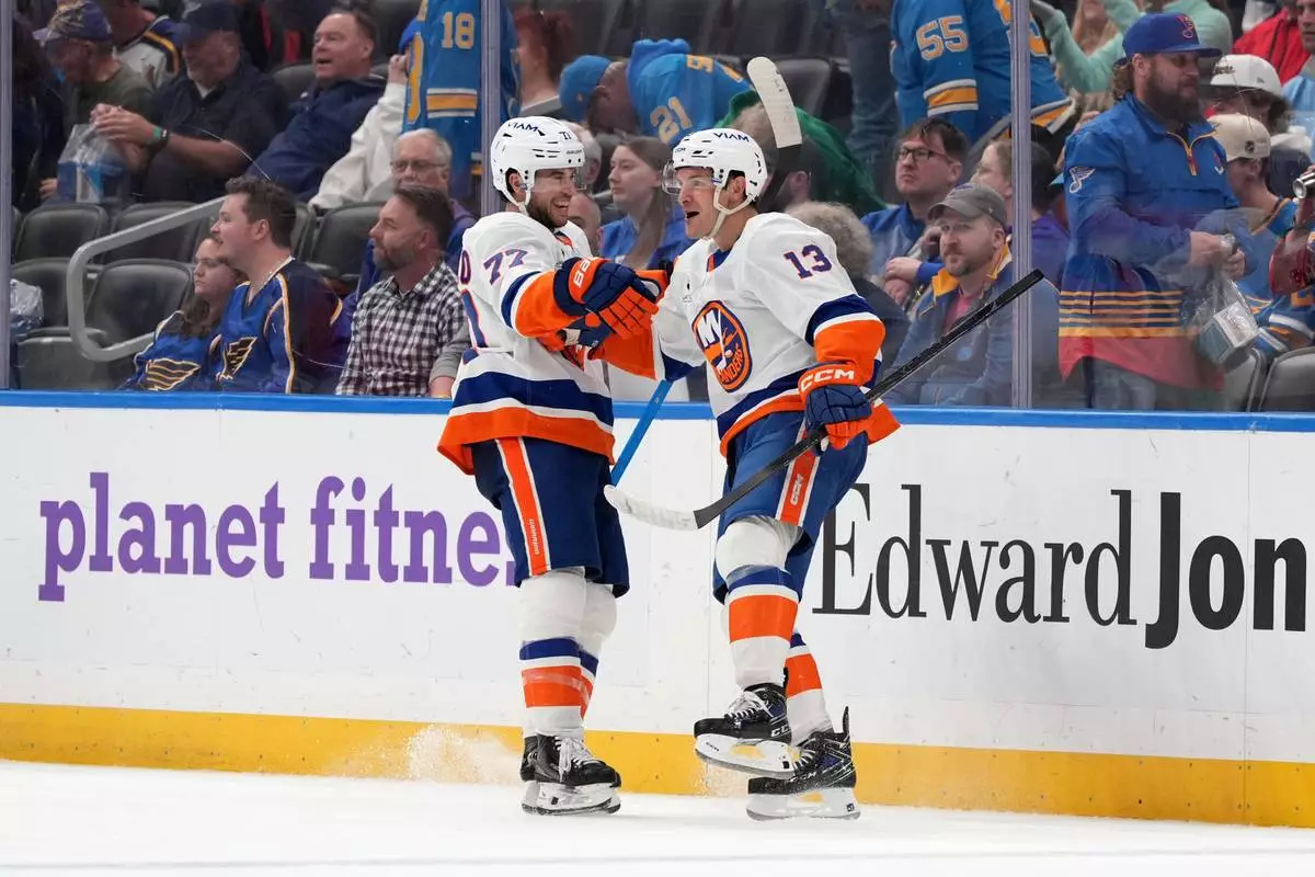 New York Islanders' Mathew Barzal (13) celebrates after scoring during overtime of an NHL hockey game to defeat the St. Louis Blues as teammate Tony DeAngelo (77) looks on Tuesday, March 10, 2026, in St. Louis. (AP Photo/Jeff Roberson)