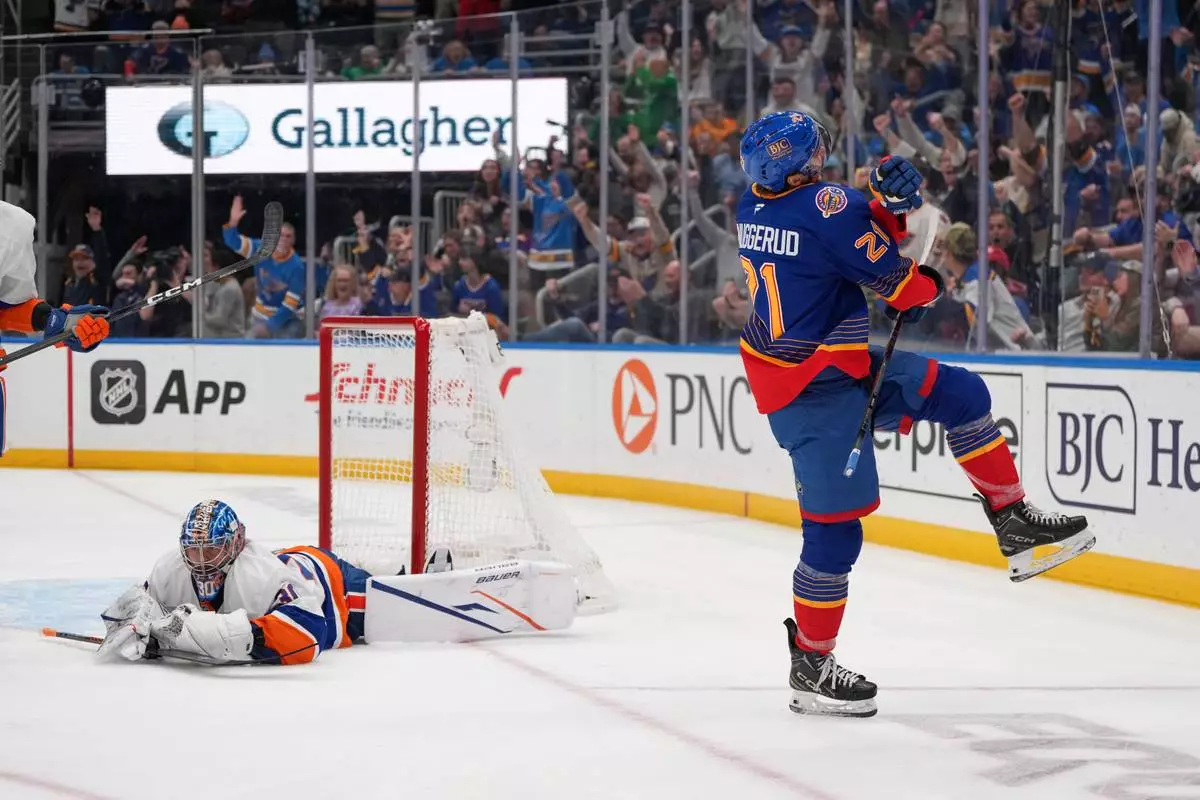 St. Louis Blues' Jimmy Snuggerud (21) celebrates after scoring past New York Islanders goaltender Ilya Sorokin, left, during the second period of an NHL hockey game Tuesday, March 10, 2026, in St. Louis. (AP Photo/Jeff Roberson)