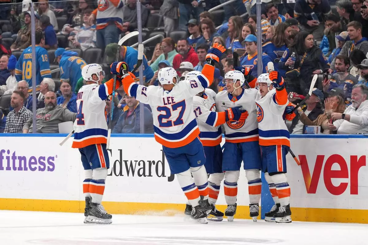 New York Islanders' Mathew Barzal, second from right, celebrates after scoring during overtime of an NHL hockey game to defeat the St. Louis Blues Tuesday, March 10, 2026, in St. Louis. (AP Photo/Jeff Roberson)
