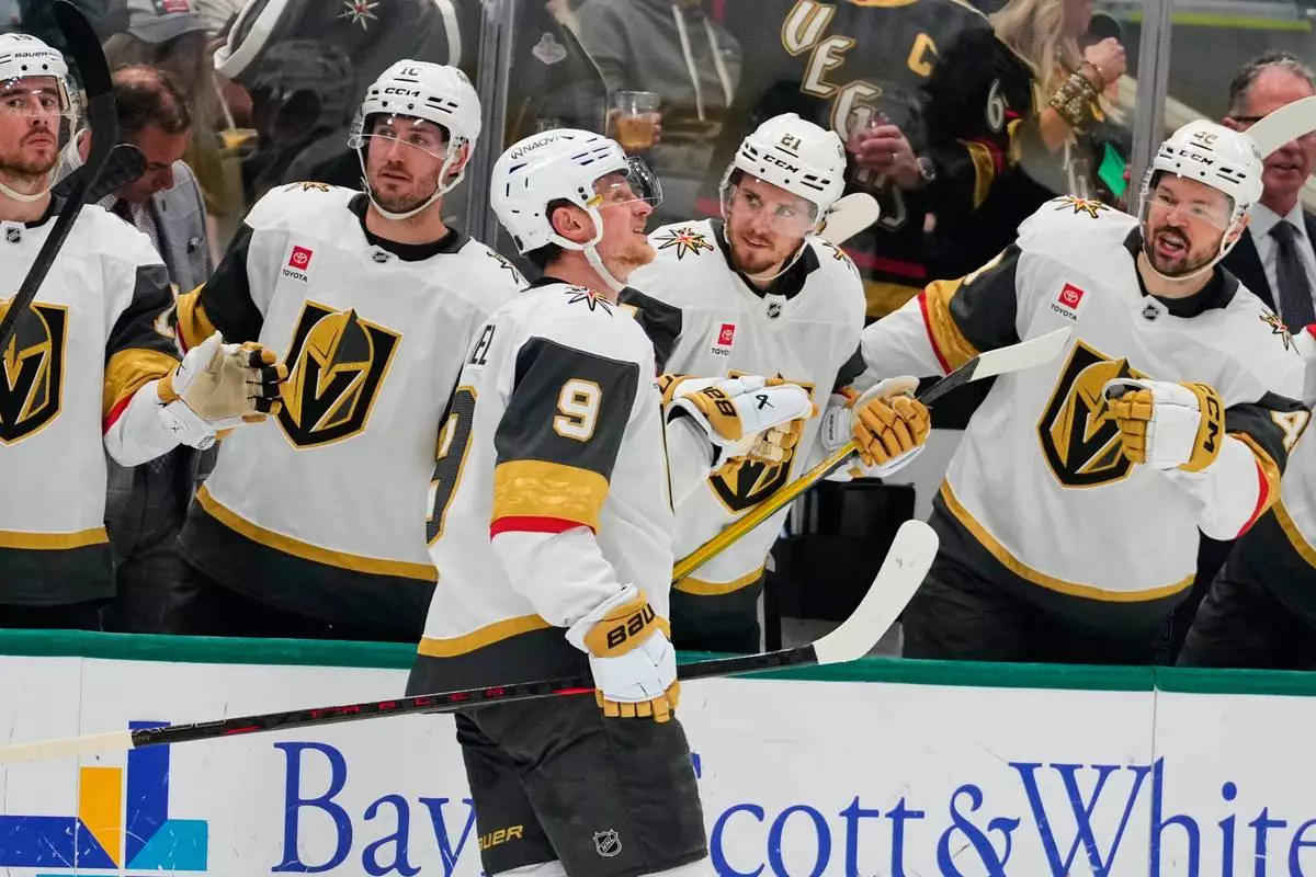 Vegas Golden Knights center Jack Eichel (9) celebrates with the team after scoring in the second period of an NHL hockey game against the Dallas Stars in Dallas, Tuesday, March 10, 2026. (AP Photo/Tony Gutierrez)