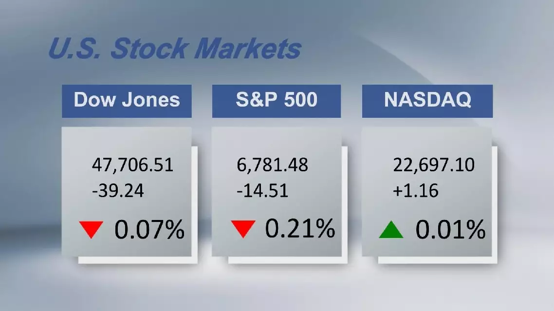 The Dow Jones Industrial Average fell by 0.07 percent, to 47,706.51. The S&P 500 sank 0.21 percent to 6,781.48. The Nasdaq Composite Index increased by 0.01 percent to 22,697.10.