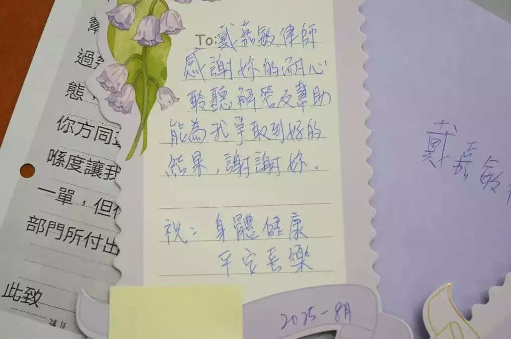 She said that sometimes they encounter cases with "insufficient" evidence. For instance, a construction worker failed to report his injury immediately after the incident and delayed seeking medical treatment. Moreover, he did not mention that it was a work-related injury when he saw the doctor, leading to discrepancies between the medical records and the actual time of the incident. As a result, the case stretched on for nearly three years. Through repeated communication and painstaking efforts to clarify details, the legal aid counsels gradually pieced together a complete and detailed witness statement. Ultimately, a settlement was successfully reached before trial. Although the compensation amount was slightly lower than initially hoped, the client was deeply moved knowing that the legal aid counsels had "given their all". Seeing the smiles on the faces of those they help, the legal aid team is reminded of the profound meaning and value of their work.