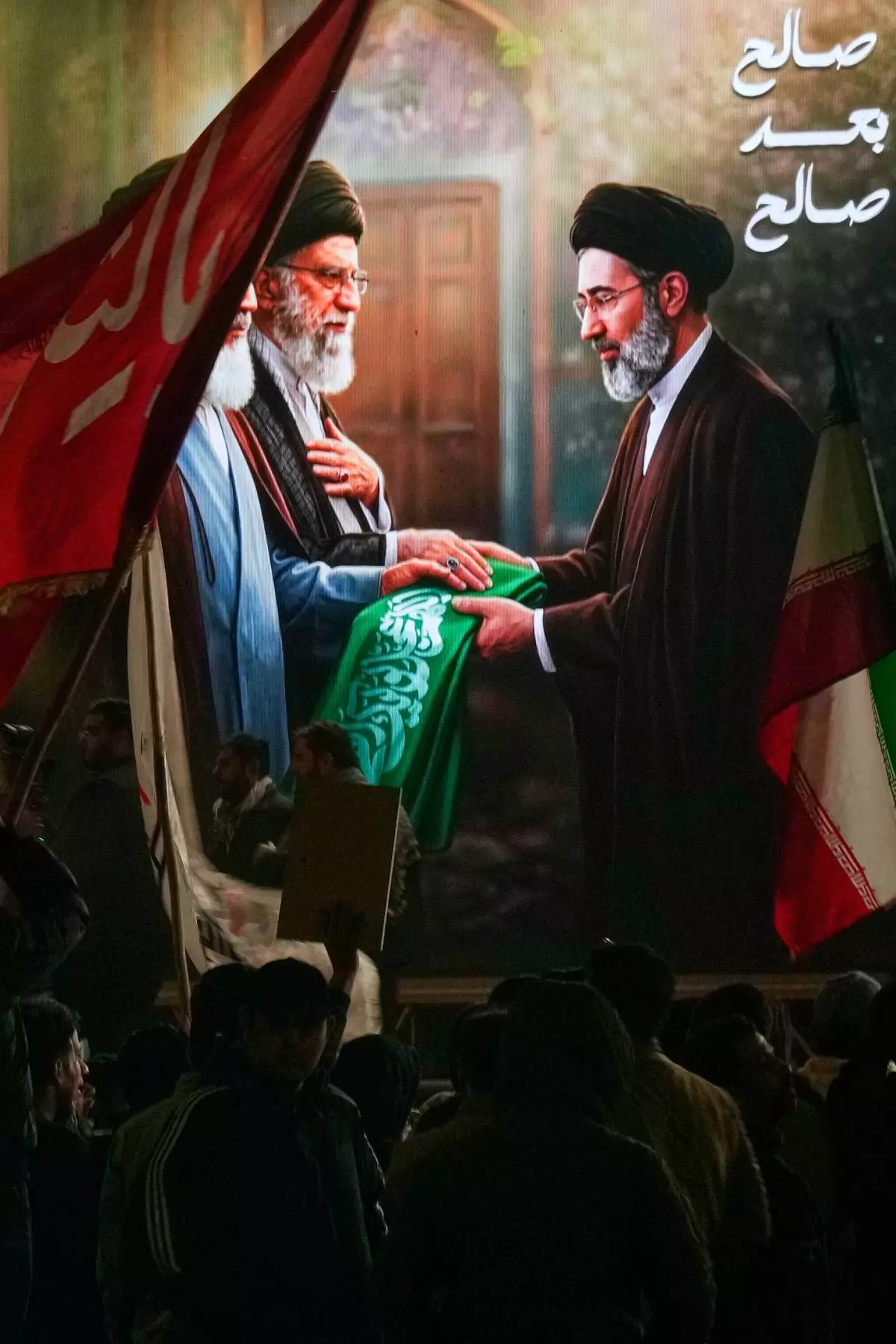 Motorbikes drive past a billboard depicting Iran’s late Supreme Leader Ayatollah Ali Khamenei, center, handing the country’s flag to his son and successor Ayatollah Mojtaba Khamenei, right, as the late revolutionary founder Ayatollah Ruhollah Khomeini stands at left, in a square in downtown Tehran, Iran, Tuesday, March 10, 2026. (AP Photo/Vahid Salemi)