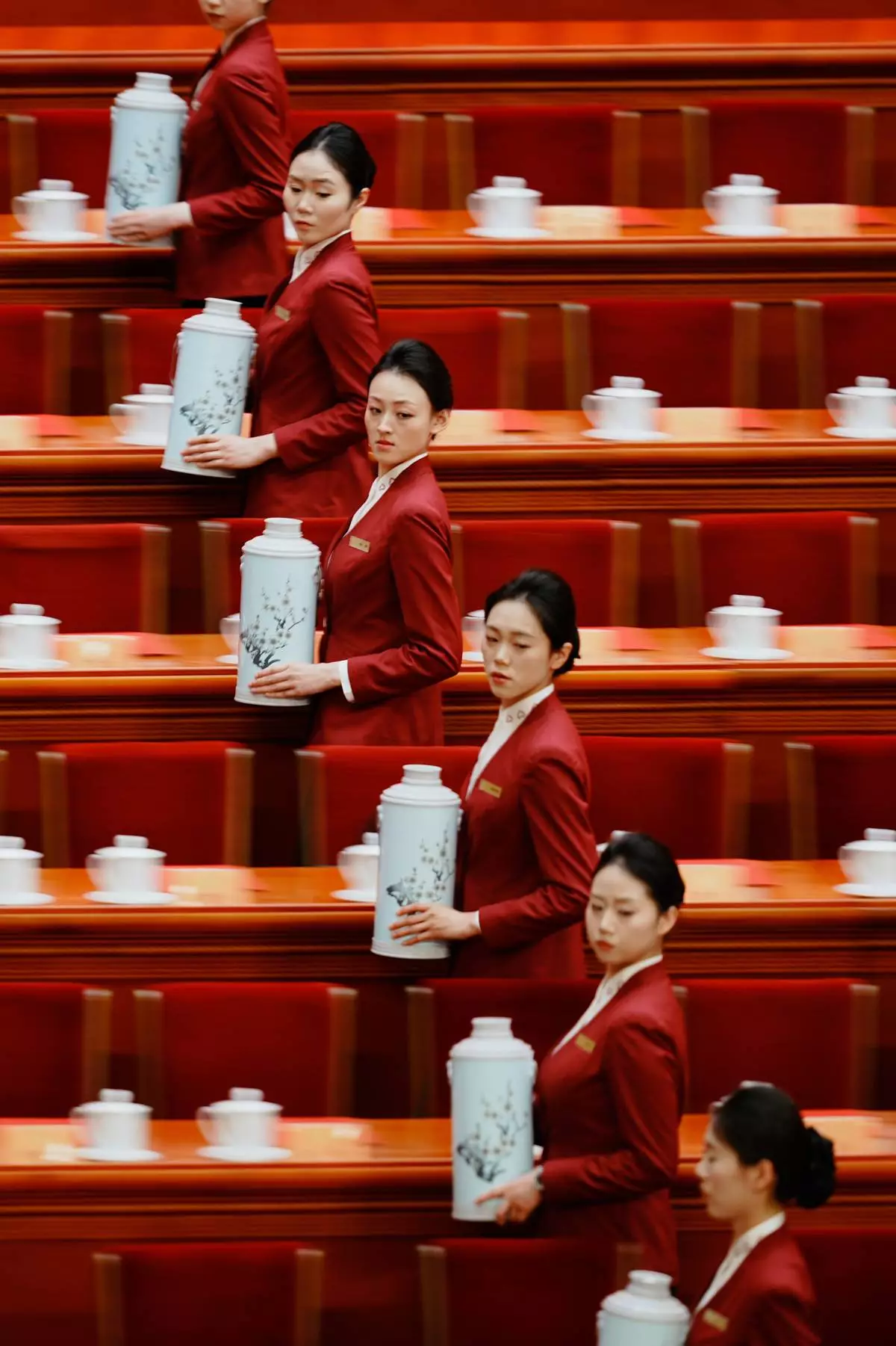 FILE - Hostesses prepare tea for delegates before the closing ceremony of the Chinese People's Political Consultative Conference (CPPCC) at the Great Hall of the People in Beijing, March 11, 2026. (AP Photo/Vincent Thian, File)
