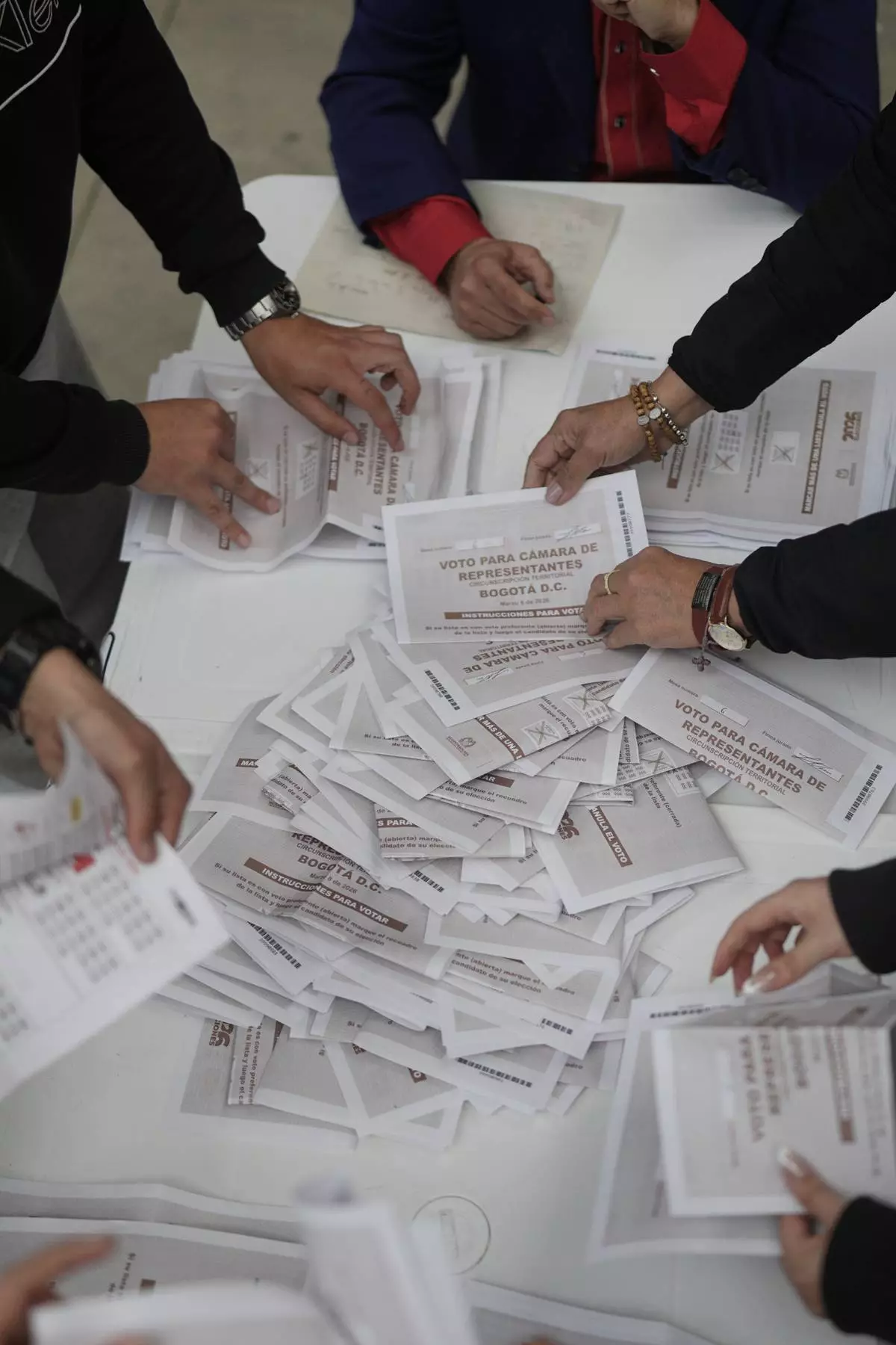 FILE - Election workers count ballots after voting ended after polls closed in legislative elections in Bogota, Colombia, March 8, 2026. (AP Photo/Ivan Valencia, File)