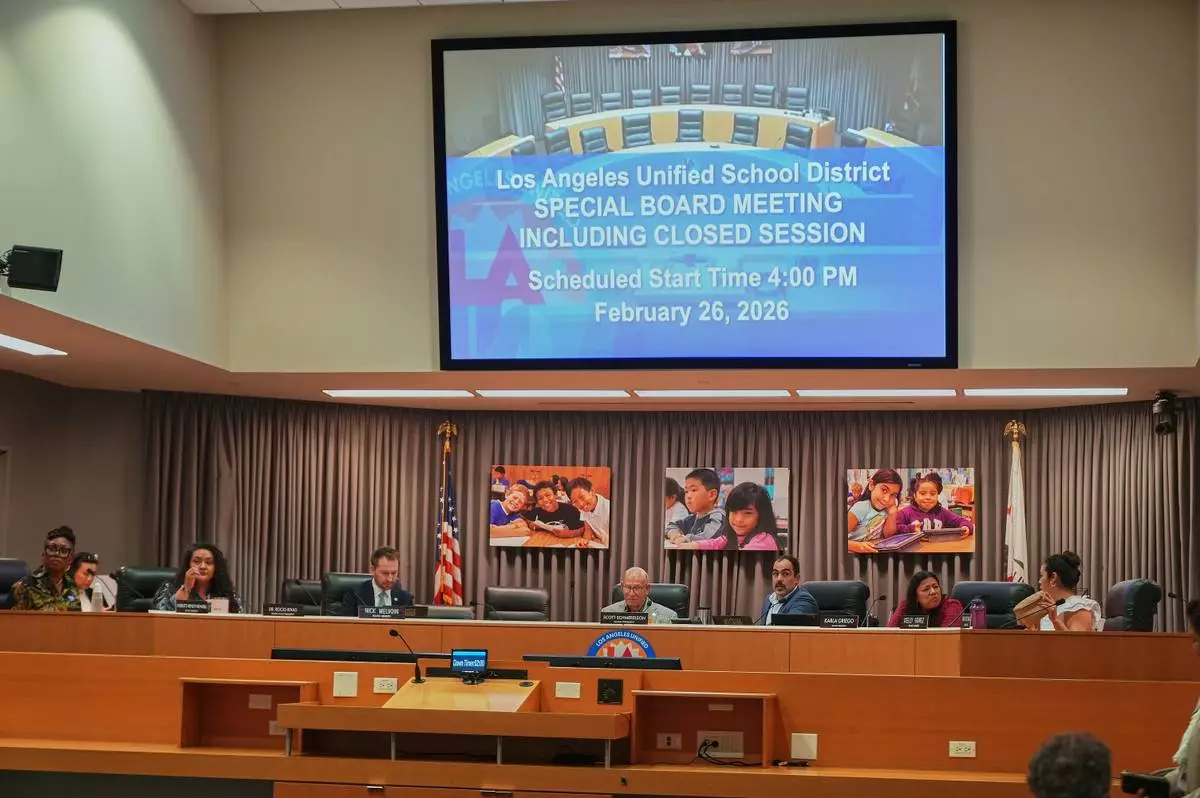 Los Angeles Unified School District board members listen to online public comments during a meeting at LAUSD headquarters before a special closed session with Superintendent Alberto Carvalho, Thursday, Feb. 26, 2026, in Los Angeles. (AP Photo/Damian Dovarganes)