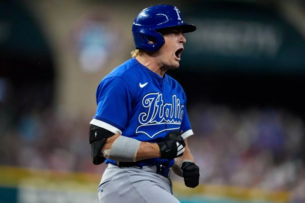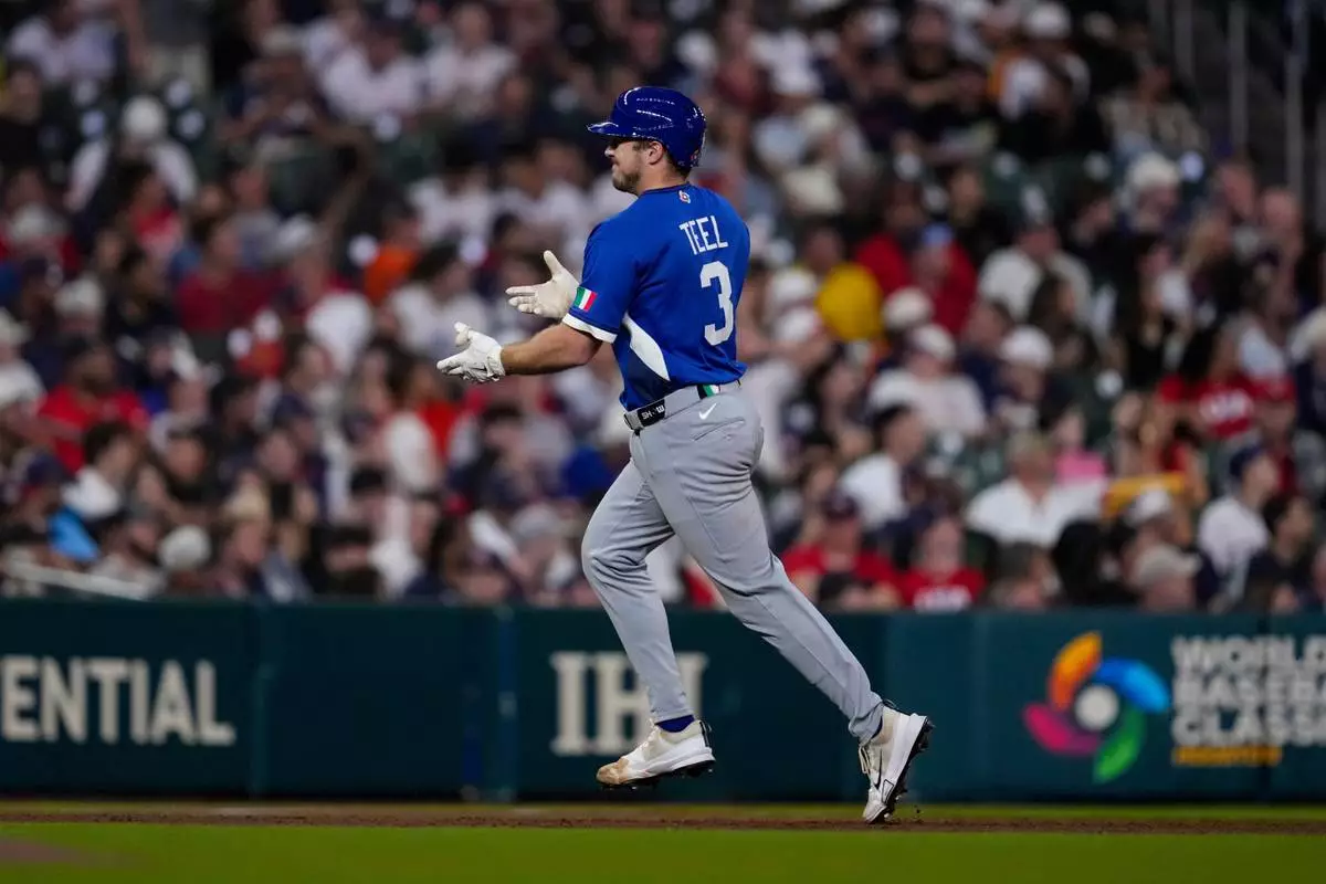 Italy catcher Kyle Teel (3) celebrates as he run the bases after a home run against the United States inning of a World Baseball Classic game, Tuesday, March 10, 2026, in Houston. (AP Photo/Ashley Landis)