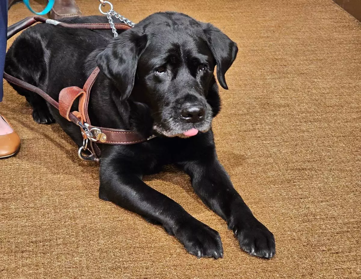 A service dog named Alfred, who belongs to college student Tori Andres, attends a news conference at the State Capitol in St. Paul, Minn. on Wednesday, March 11, 2026, where state Human Rights Commissioner Rebecca Lucero announced a settlement with the ride-sharing company Lyft that will ensure the rights of blind and other disabled passengers across the country to travel with their service animals. (AP Photo/Steve Karnowski)