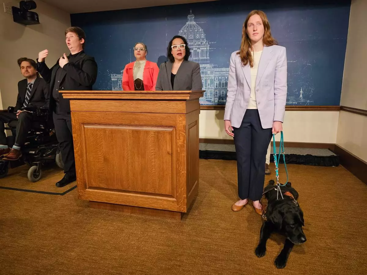 Minnesota Human Rights Commissioner Rebecca Lucero, at the podium, holds a news conference at the State Capitol in St. Paul on Wednesday, March 11, 2026, to announce a settlement with the ride-sharing company Lyft that will ensure the rights of blind and other disabled passengers across the country to travel with their service animals. College student Tori Andres, right, turned to the Minnesota Department of Human Rights after several Lyft drivers refused to let her service dog, Alfred, ride along with her. (AP Photo/Steve Karnowski)