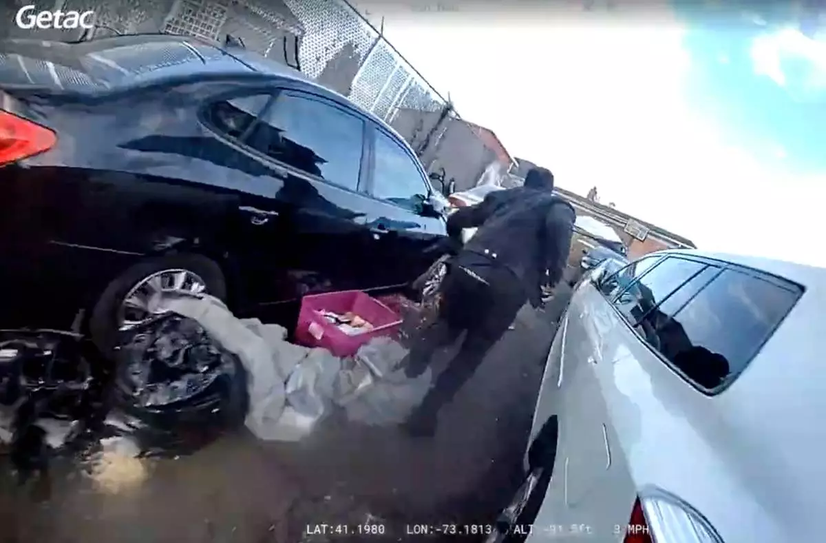 In this photo taken from video released by the Bridgeport Police Department, Dyshan Best looks up at Bridgeport Police officer Yoon Heo after being shot by Heo during a chase, Monday, March 31, 2025, in Bridgeport, Conn. (Bridgeport Police Department via AP)
