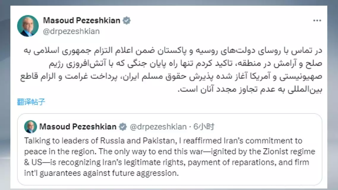 In a post on social media platform X, Pezeshkian voiced "Iran's commitment to peace in the region."