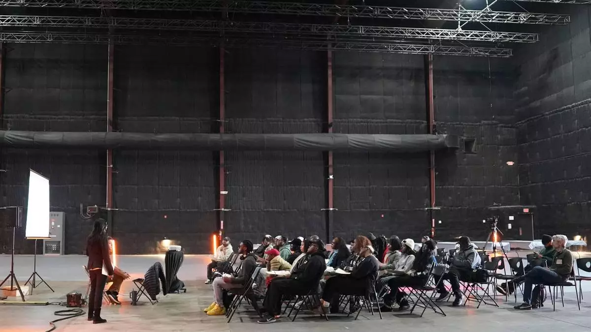 College students listen to a lecture on how to become a production assistant during a Shadowbox Studios tour, Wednesday, Nov. 12, 2025, in Atlanta. (AP Photo/Emilie Megnien)