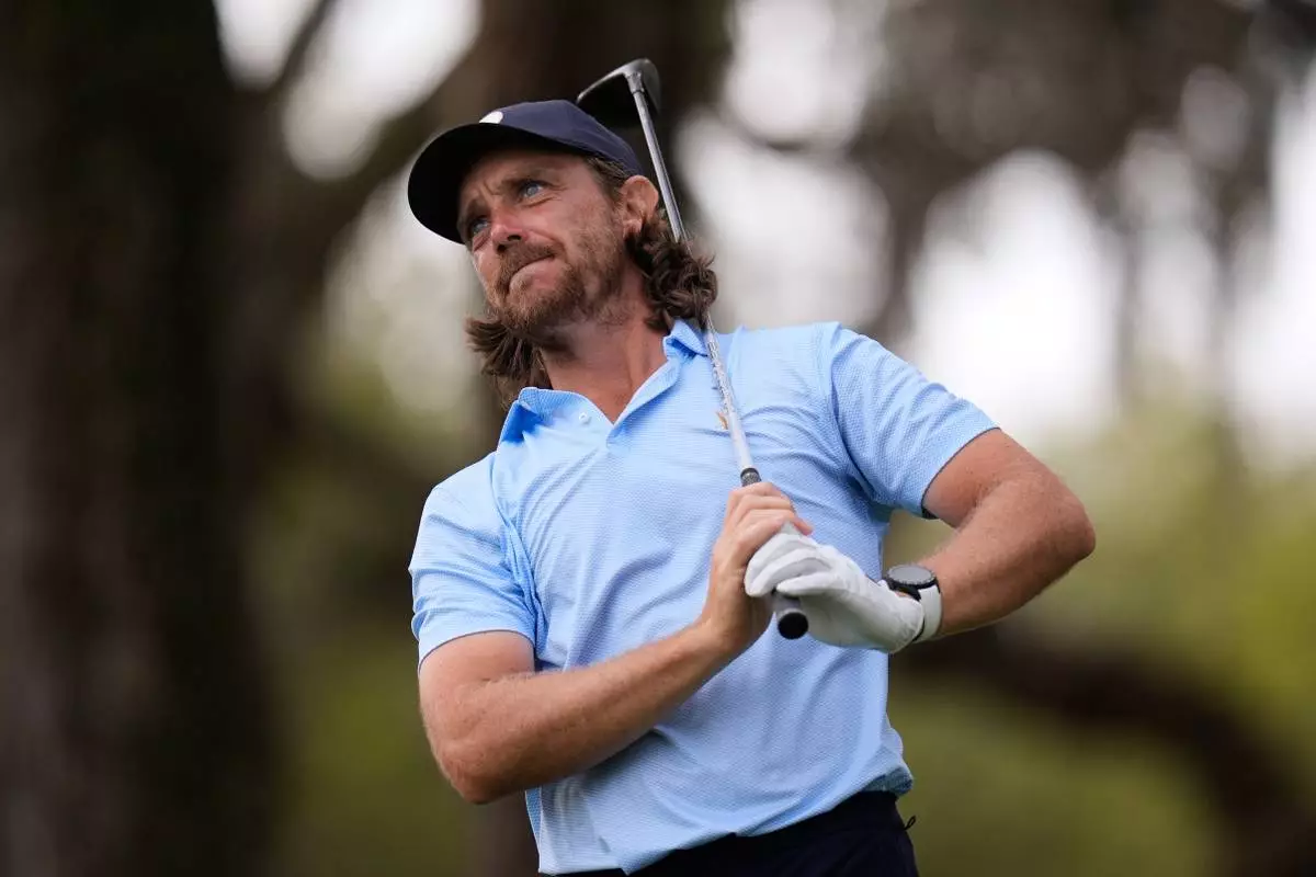 Tommy Fleetwood of England reacts to his tee shot on the 12th hole during the first round of The Players Championship golf tournament Thursday, March 12, 2026, in Ponte Bedra Beach, Fla. (AP Photo/Gerald Herbert)