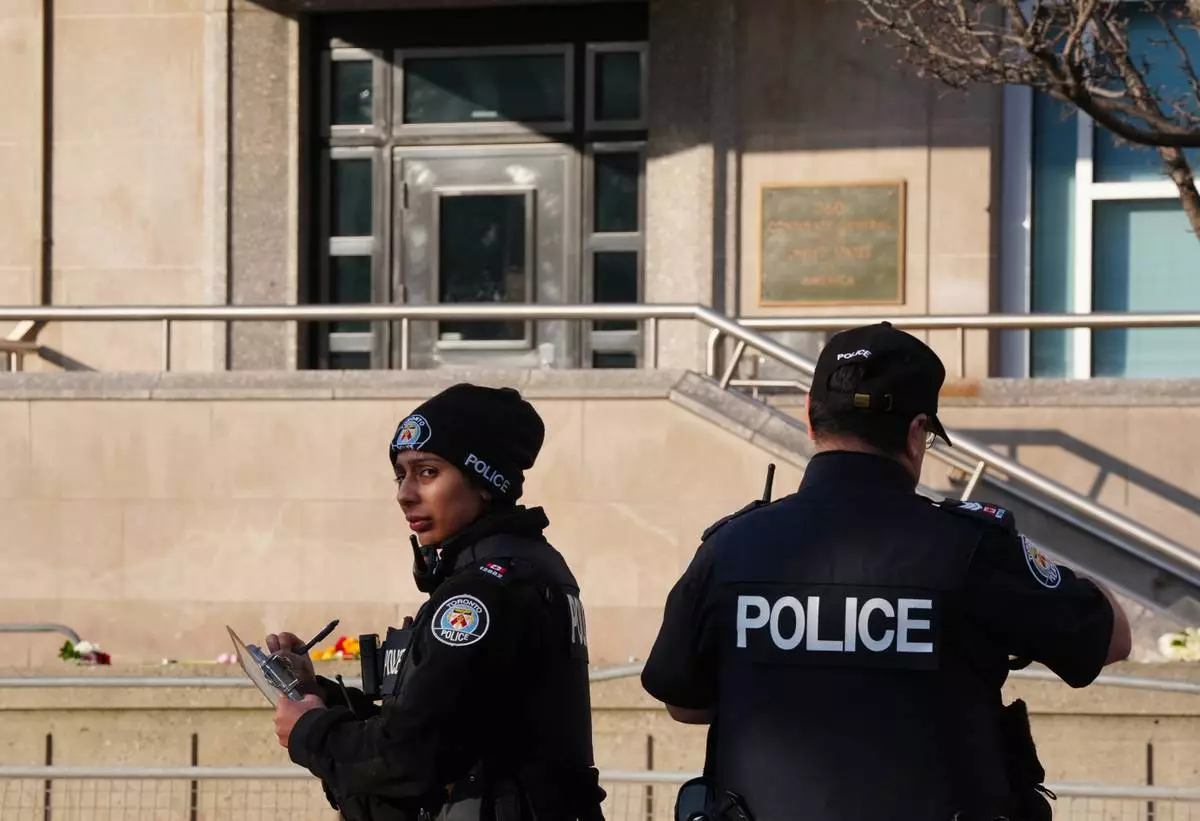 Toronto police investigate the scene after the U.S. consulate was hit by gunfire in Toronto on Tuesday March 10, 2026. (Frank Gunn /The Canadian Press via AP)